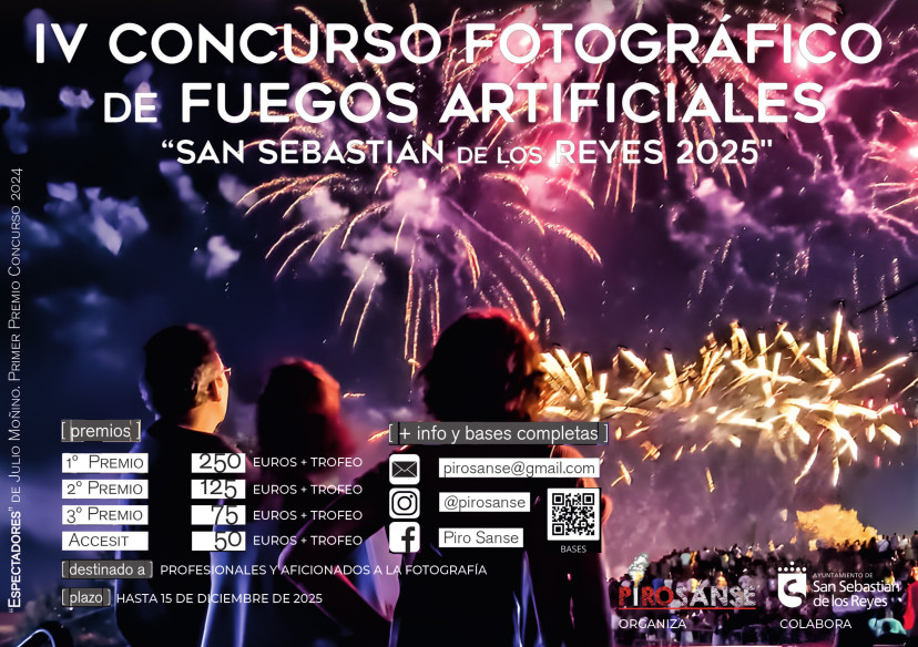 La Asociación Pirosanse, en colaboración con el Ayuntamiento, convoca la cuarta edición del Concurso Fotográfico de Fuegos Artificiales ‘San Sebastián de los Reyes 2025’. Se trata de una iniciativa cultural y artística consolidada en el municipio, que busca fomentar la creatividad y dar a conocer la riqueza visual de los espectáculos pirotécnicos locales.