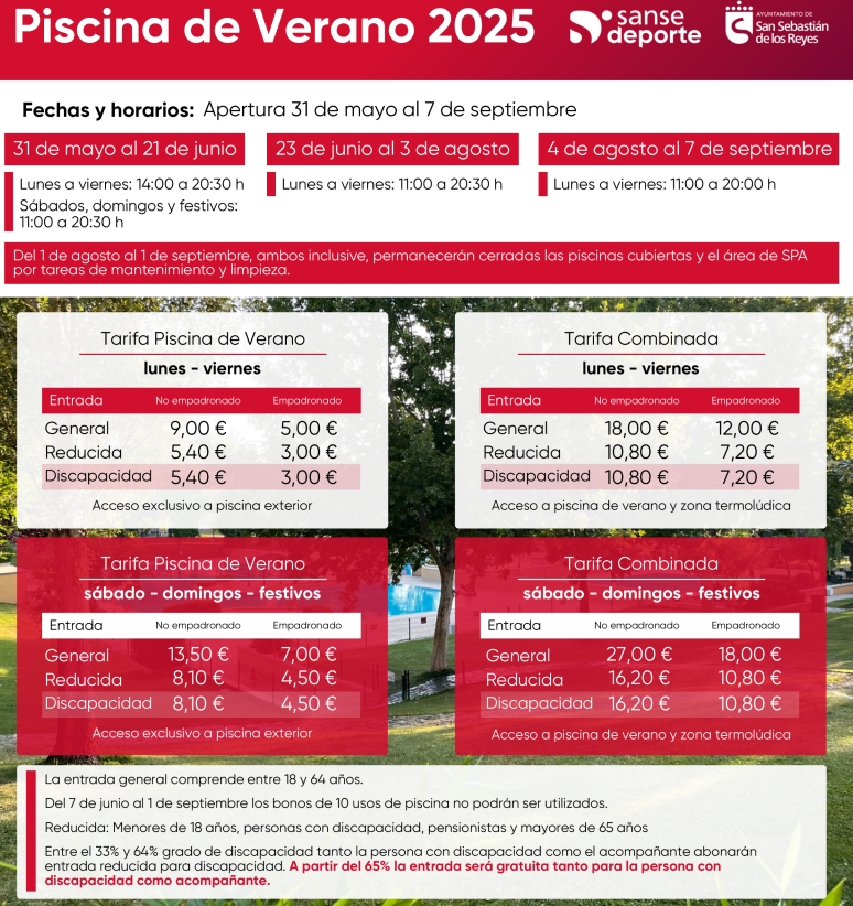 Las tarifas varían según el tipo de entrada: la básica da acceso a las piscinas exteriores y la entrada combi incluye también la zona termolúdica interior. Para personas empadronadas, el precio general es de 5 € de lunes a viernes y 7 € fines de semana y festivos. Existen tarifas reducidas para personas con discapacidad, menores de 18 años, mayores de 65 y pensionistas, previa acreditación, con un coste de 3€ entre semana y 4,5€ el fin de semana.