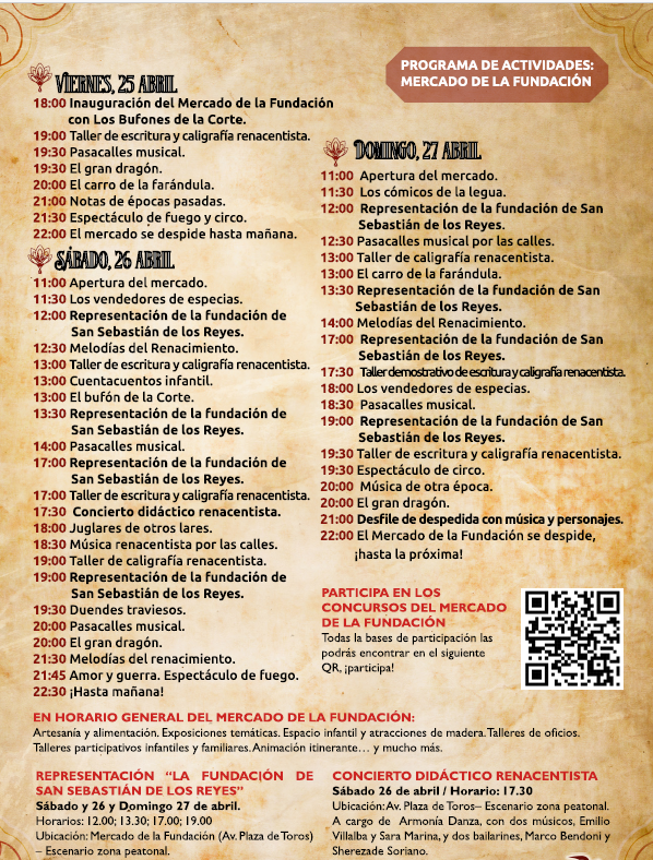 Contará, así mismo, con talleres infantiles, de oficios antiguos como el mimbre, la piedra, la cerámica, la orfebrería o el soplado de vidrio, y también talleres de caligrafía, representaciones teatrales con la temática de la fundación del municipio y un concierto renacentista con baile de época.