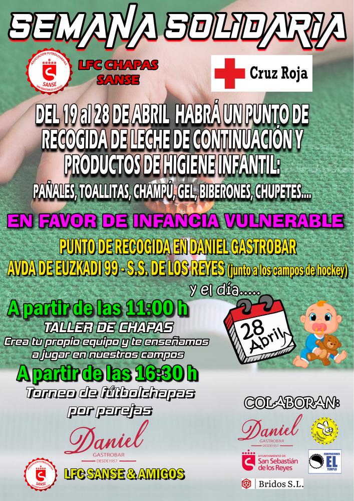 La Asociación Fútbolchapas Sanse junto con Daniel Gastrobar organizamos una semana solidaria de recogida de productos de higiene infantil a favor de Cruz Roja.